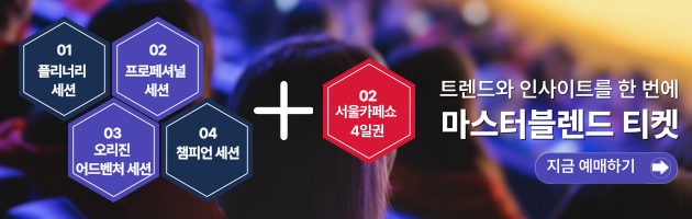 마스터블렌드 티켓, 혜택 대폭 확대 지난달 얼리버드로 출시된 마스터블렌드 티켓이 이번 달부터 한층 더 풍성한 경험을 제공합니다. · 기존: 플리너리 세션 + 서울카페쇼 4일권 · 변경: 포럼 전 세션 무제한 참여 + 서울카페쇼 4일권 ※ (플리너리·프로페셔널·오리진 어드벤처·챔피언 세션 포함 / SCA 교육 프로그램 제외) WCLF는 여러분이 서울카페쇼의 다채로운 전시와 함께 더 깊고 전문적인 지식과 미래를 위한 인사이트를 온전히 경험하실 수 있도록 혜택을 대폭 확장했습니다. 이제 한 번의 등록만으로 전시와 포럼을 자유롭게 오가며, 전 세계 전문가들의 인사이트와 산업 트렌드를 현장에서 모두 체험하실 수 있습니다. |