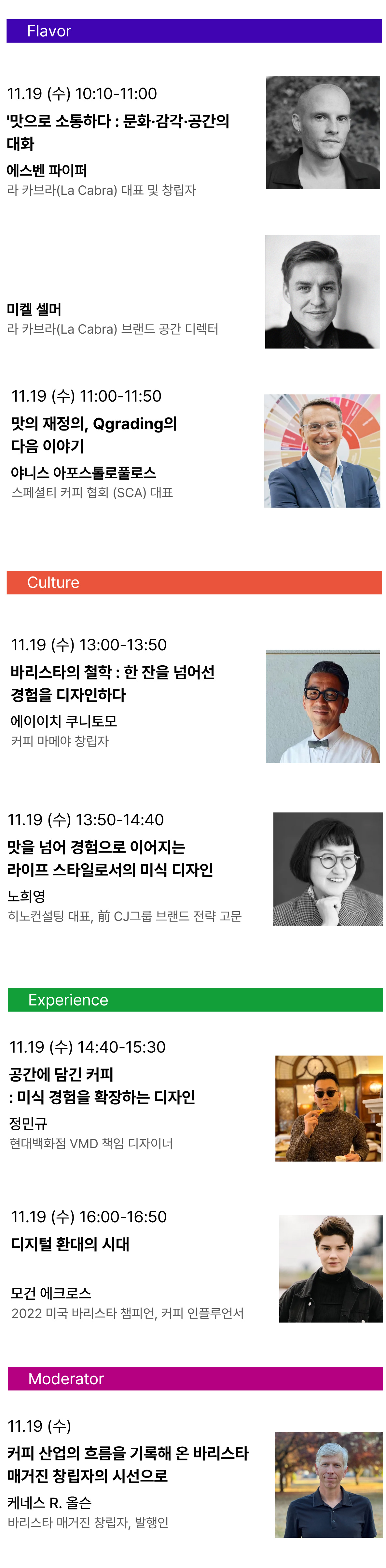 | 16:00 - 16:50 | 경험 | 모건 에크로스 2022 U.S. Barista Champion, Creator |